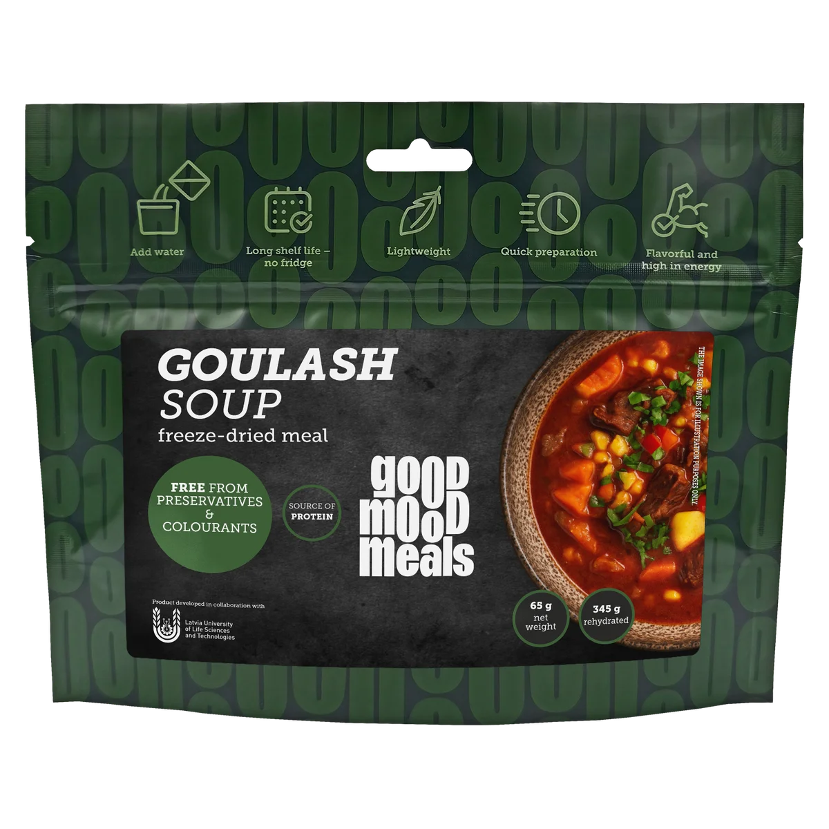 Zupas mērce (burkāni, paprika, tomātu pasta (tomāti), rapšu eļļa, kviešu milti, sīpoli, selerijas, cukurs, sāls, garšvielas (sāls, paprika, sīpoli, melnie pipari, rauga ekstrakts, seleriju sēklas, ķiploki, kajēnas pipari, asie pipari)), kartupeļi, cūkgaļa (18 %).