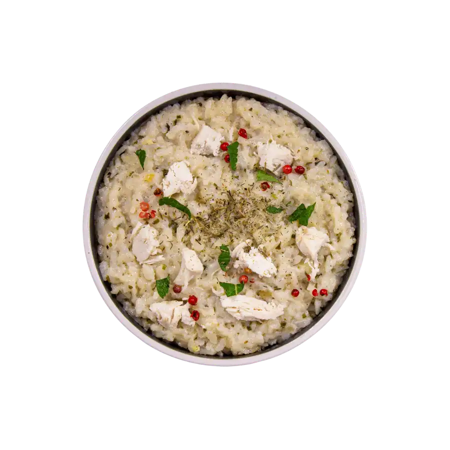 Rice (55%), chicken fillet (20%), cream, rapeseed oil, white wine, chicken broth (contains celery), cheese, dried onions, dry herbs (scallions, basil), pepper, salt.
