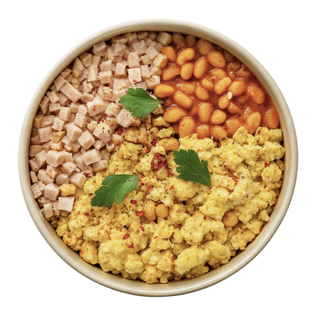 Omelette (eggs 58%, beans in tomato sauce 35% (beans, tomatoes, salt), water, salt, cheese, rapeseed oil, onions, spices), hot smoked pork (pork ham 96%, water, salt, wheat fibre, garlic granules, dextrose, black pepper).